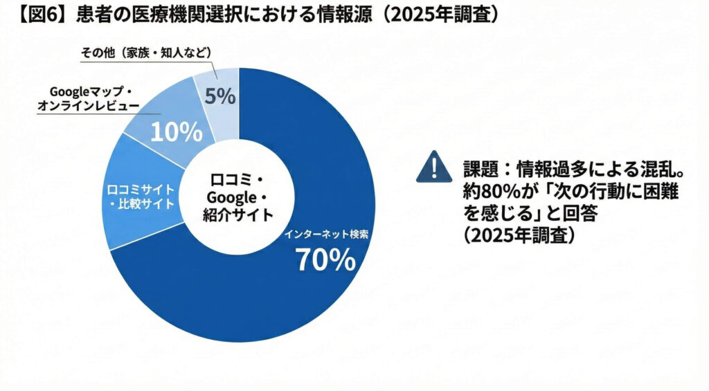 ※2025年調査では、約70%の患者がインターネット検索を主要情報源として活用。年代を問わずオンラインで能動的に情報収集・比較を行い、口コミを含む総合的な評価を参考にクリニックを選択しています。また、約80%が「次の行動に困難を感じる」と回答し、情報過多による混乱も課題となっています。