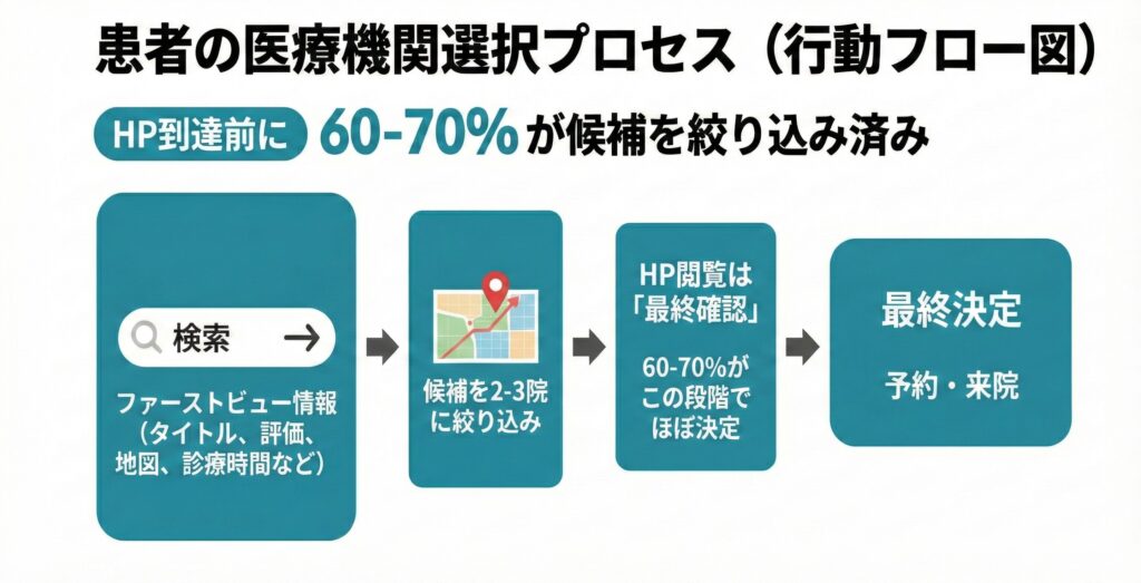 ※現在の患者は、検索結果ページで表示されるタイトル・口コミ評価・地図情報・診療時間などの「ファーストビュー情報」だけで候補を2-3院に絞り込んでいます。ホームページは「最終確認」の位置づけであり、HP到達前の段階で選択の大半が決まっている実態が明らかになっています。