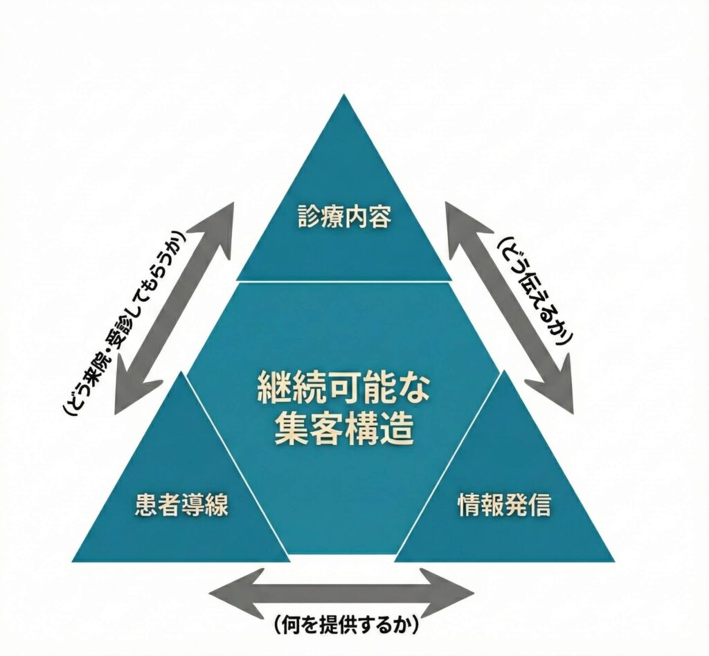 ※集客を「個別施策の積み重ね」ではなく「全体設計」として捉えることが重要です。診療内容(何を提供するか)、患者導線(どう来院・受診してもらうか)、情報発信(どう伝えるか)の3要素を一体として設計することで、無理なく継続可能な集客構造が実現します。