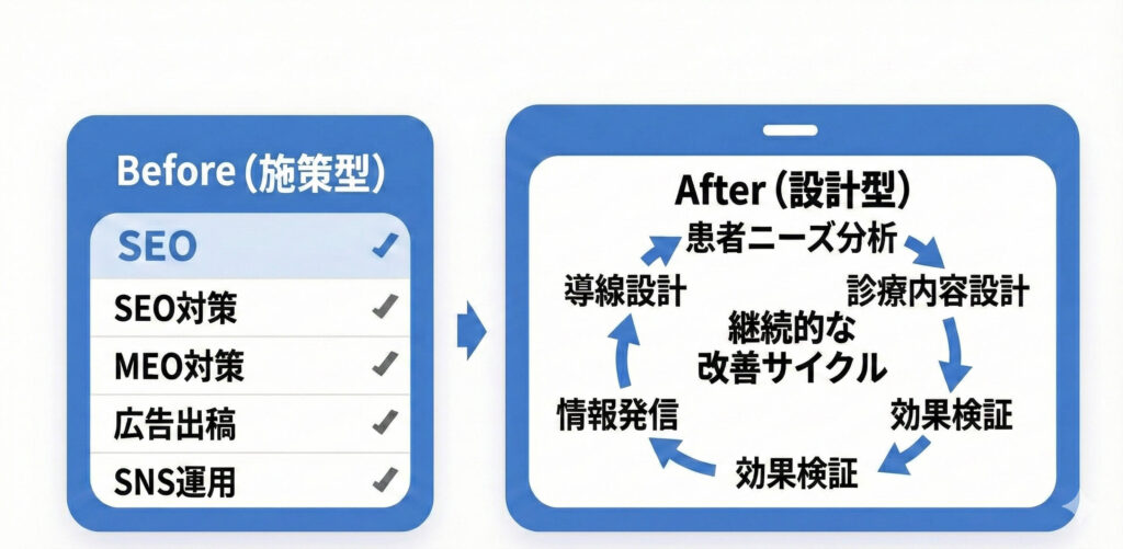 ※従来の「施策型」では、個別の対策を積み重ねるため全体最適が難しく、効果検証も困難でした。「設計型」では、患者の行動プロセス全体を見据えた一体設計により、各要素が相互に補強し合う構造を作ります。これにより、現場負担を抑えながら持続可能な集客が実現します。