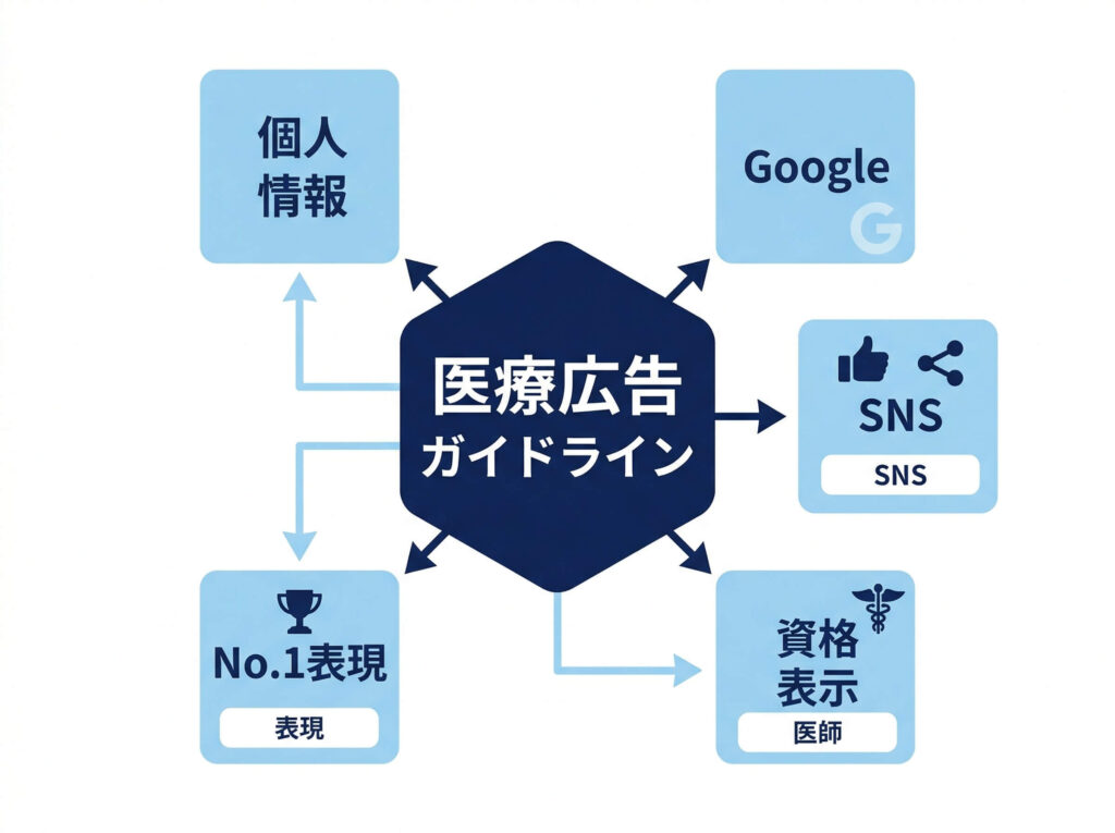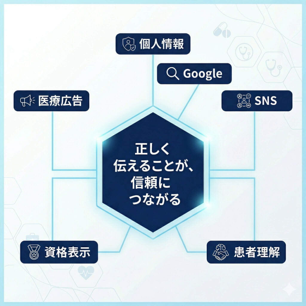 土台は医療広告ガイドラインです。その上に、個人情報保護、GoogleやSNSのポリシー、資格表示の注意点が重なってきます。