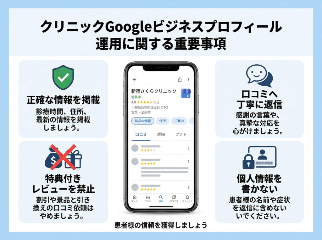 Google 側のポリシー上も公開投稿の適切性が求められますし、医療機関としては個人情報保護の観点からも慎重な対応が必要です。