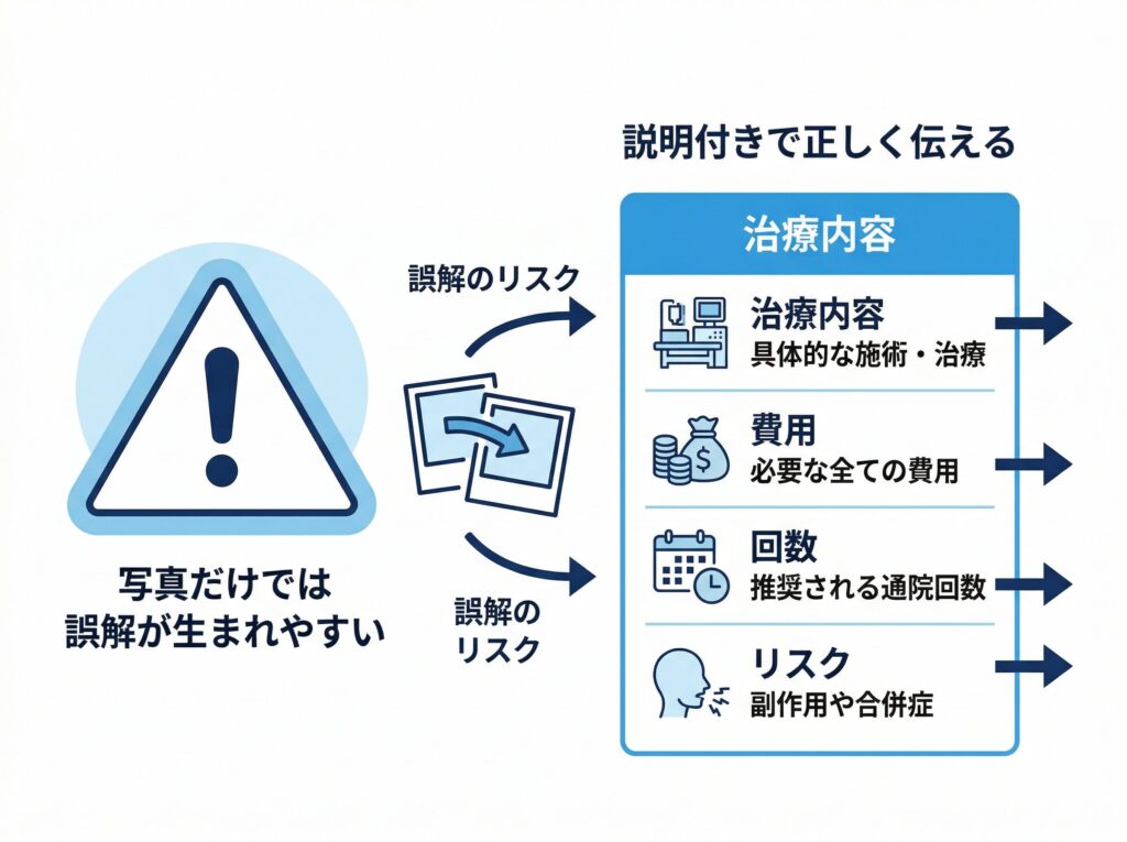 ここで大切なのは、「写真があると伝わりやすい」ことと、「患者さんが誤解しない」ことは別だという点です。