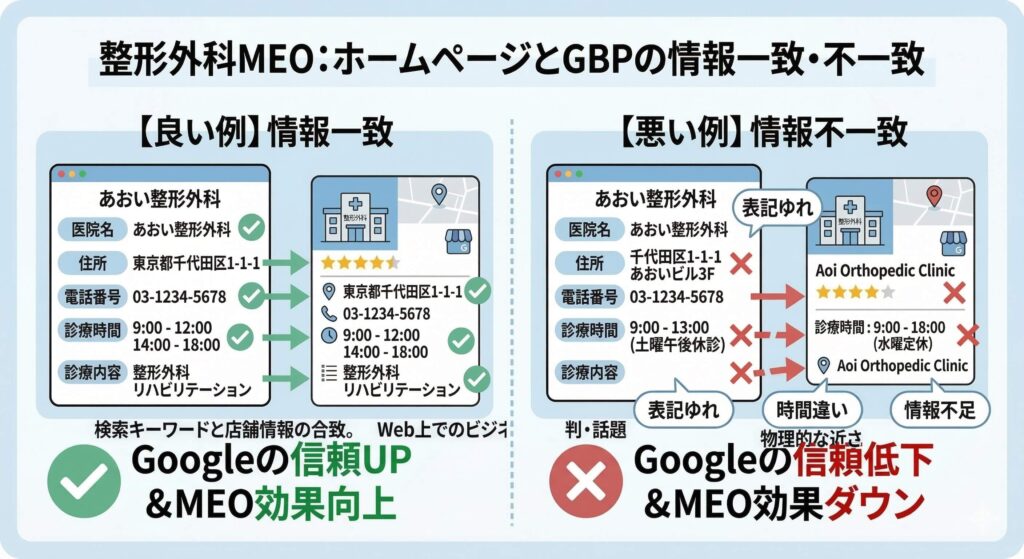整形外科で見落としやすいのが、ホームページとGoogleビジネスプロフィールの表記のずれです。