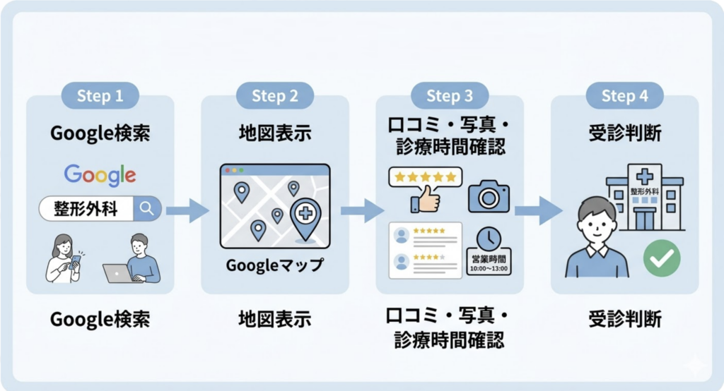 整形外科では、患者さんは「近いか」「行きやすいか」「リハビリがあるか」「雰囲気はどうか」「駐車場はあるか」といった受診前の不安を減らす情報を重視します。Googleビジネスプロフィールは、そうした情報をまとめて見せられる大事な入口です。Googleも、プロフィールを通じて営業時間、住所、連絡先、写真などを管理し、顧客が見つけやすく学びやすくなると案内しています。