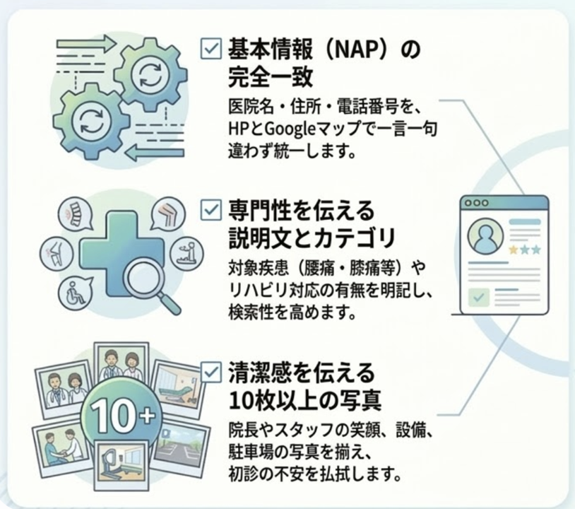 整形外科のGoogleビジネスプロフィール運用で大切なのは、初期設定を整え、カテゴリを見直し、説明文で強みを伝え、写真で安心感を見せ、口コミを院内改善につなげることです。