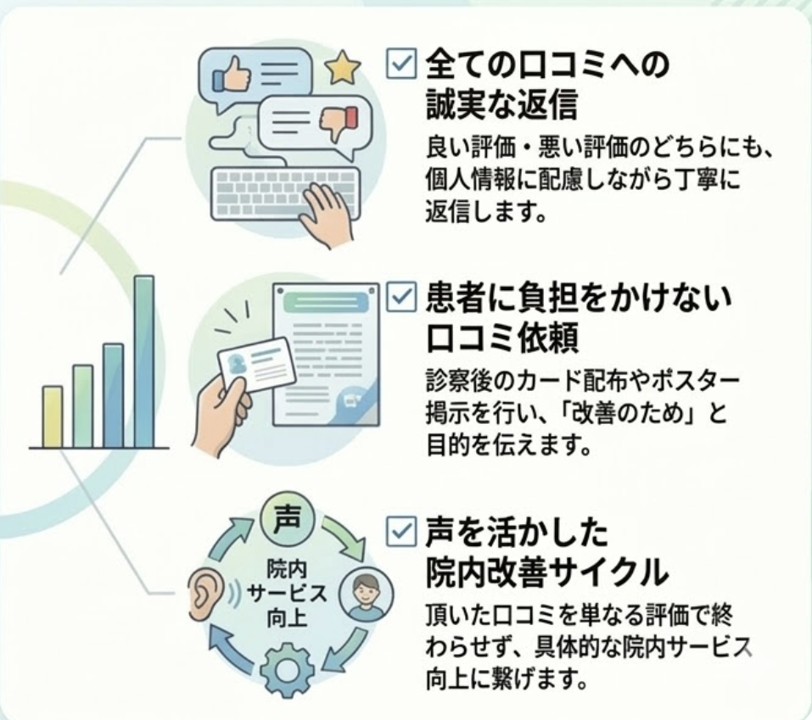 理由は、投稿してくれた本人への礼儀になるだけでなく、これから医院を探す人に対しても**「患者さんに向き合う医院だ」**と伝わるからです。
