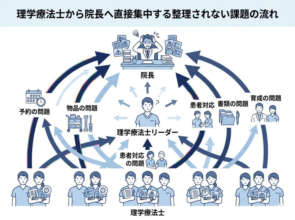 リーダーがいても、「何を見ていく立場なのか」「どこまで判断してよいのか」「何を院長に報告するのか」が曖昧だと、実際にはリーダーが機能しにくくなります。すると、スタッフは直接院長に相談するか、逆に誰にも言えずに抱え込むかのどちらかになりやすくなります。