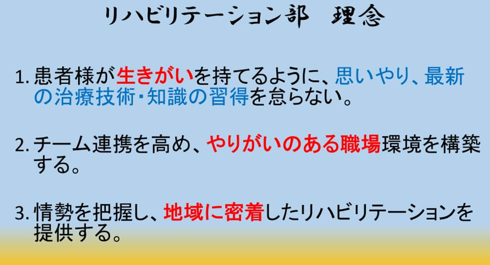 どのような医療を届けたいのか、地域にとってどんな存在でありたいのか、リハビリ部門に何を期待するのかを明確にします。ここが曖昧だと、その後の役割分担も意味が薄くなります。